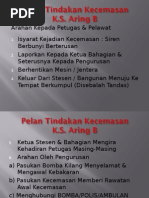 Manual pelaksanaan pelan tindakan kecemasan. Tentukan bilangan penghuni yang hilang. Tutup lokasi kejadian untuk tindakan pasukan tindakan kecemasan ukm 1/ bantuan luar. Sila masukkan tarikh pelaksanaan yang tepat. Arahan oleh pengurusan a) pasukan bomba kilang menyelamat & mengawal kebakaran b) pasukan kecemasan memberi rawatan awal.