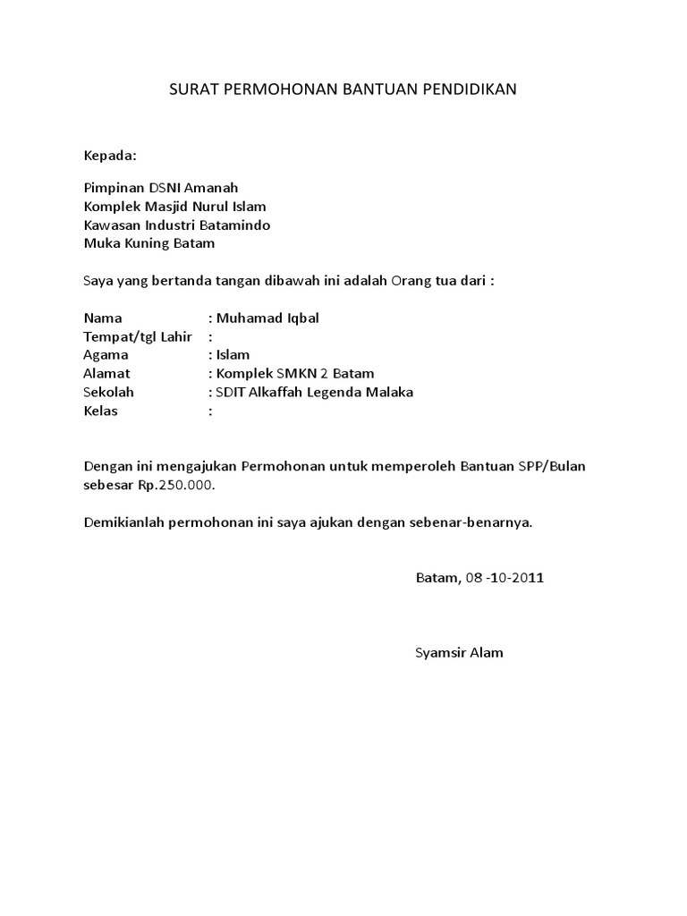 Surat Permohonan Bantuan Pendidikan - Surat ini ditujukan untuk seseorang / lembaga/pihak pemerintah/instansi dengan harapan dapat mengabulkan permohonan untuk memberikan bantuan berupa dana untuk pendidikan.. The indian medical association said private hospitals would have to shut in surat, a centre of the diamond trade in the. Ada banyak bentuk surat permohonan diantaranya, surat permohonan dana, surat permohonan izin cuti, surat permohonan kerjasama, surat alamat : Sidomulyo i balimbingan pem.tanah jawa. Contoh surat » surat permohonan » contoh surat permohonan bantuan dana pembangunan masjid. Dalam hal ini, dibutuhkan surat permohonan resmi yang ditulis dengan baik.